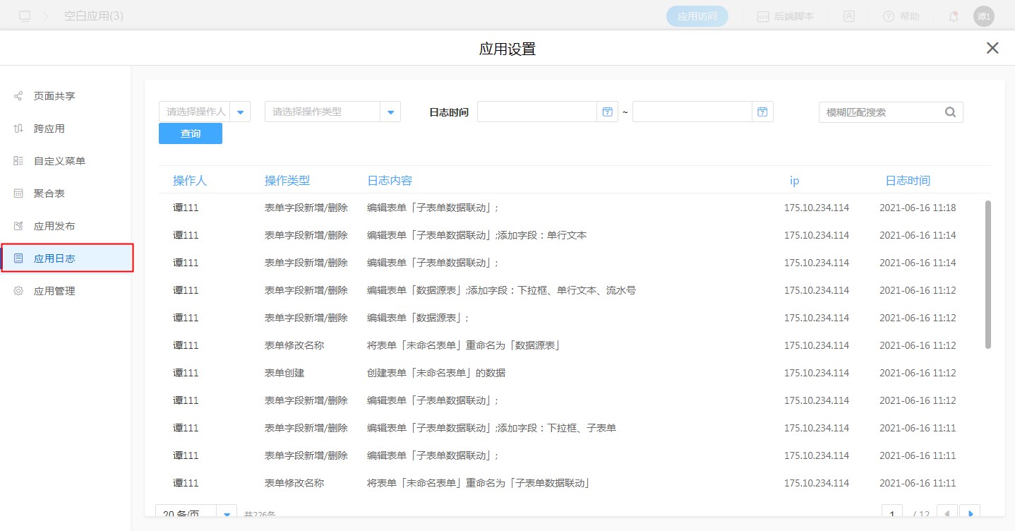 应用日志里展示了应用内的操作记录,如:表单创建记录、表单字段增添/删除、表单名称修改等等。