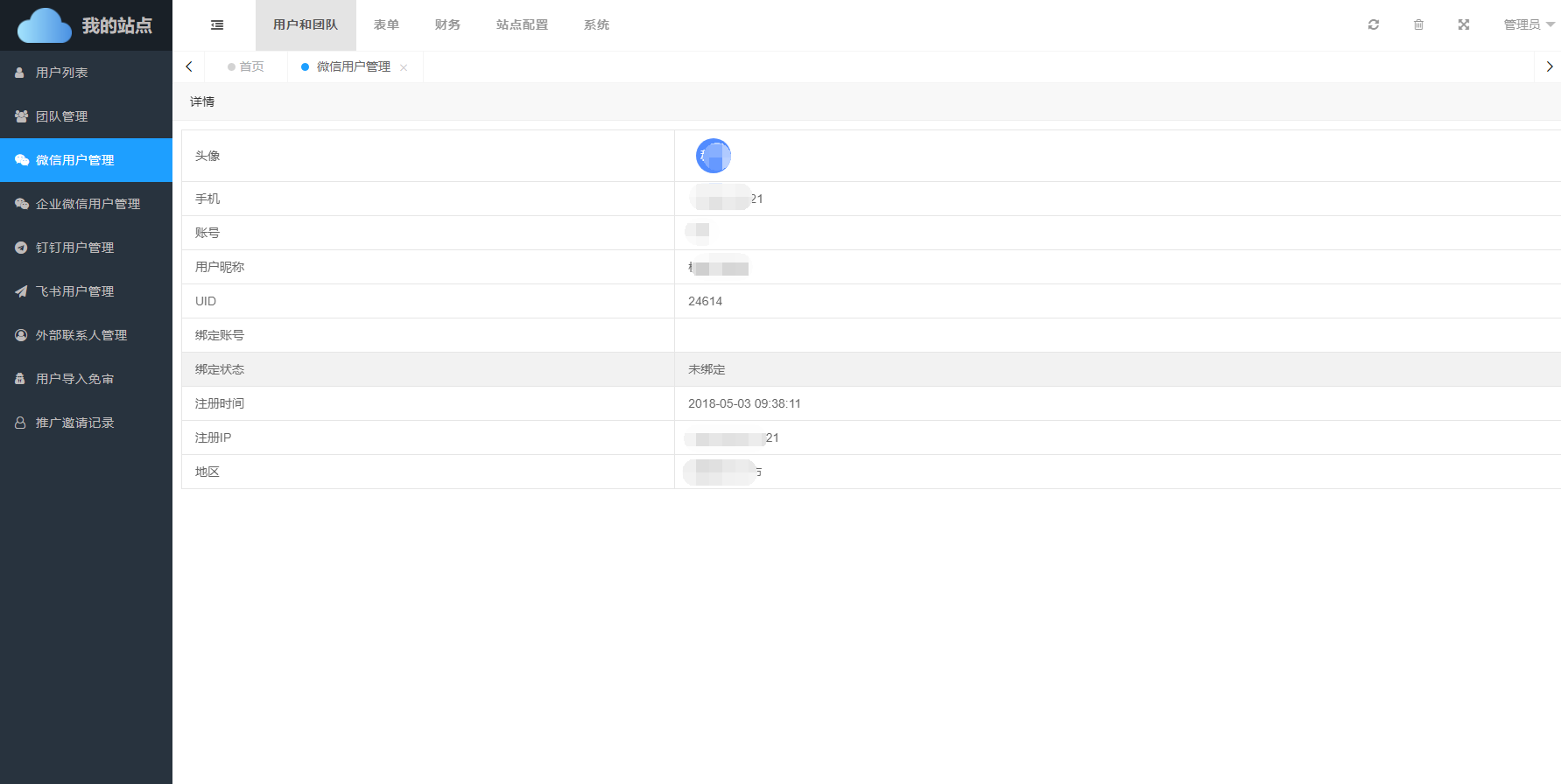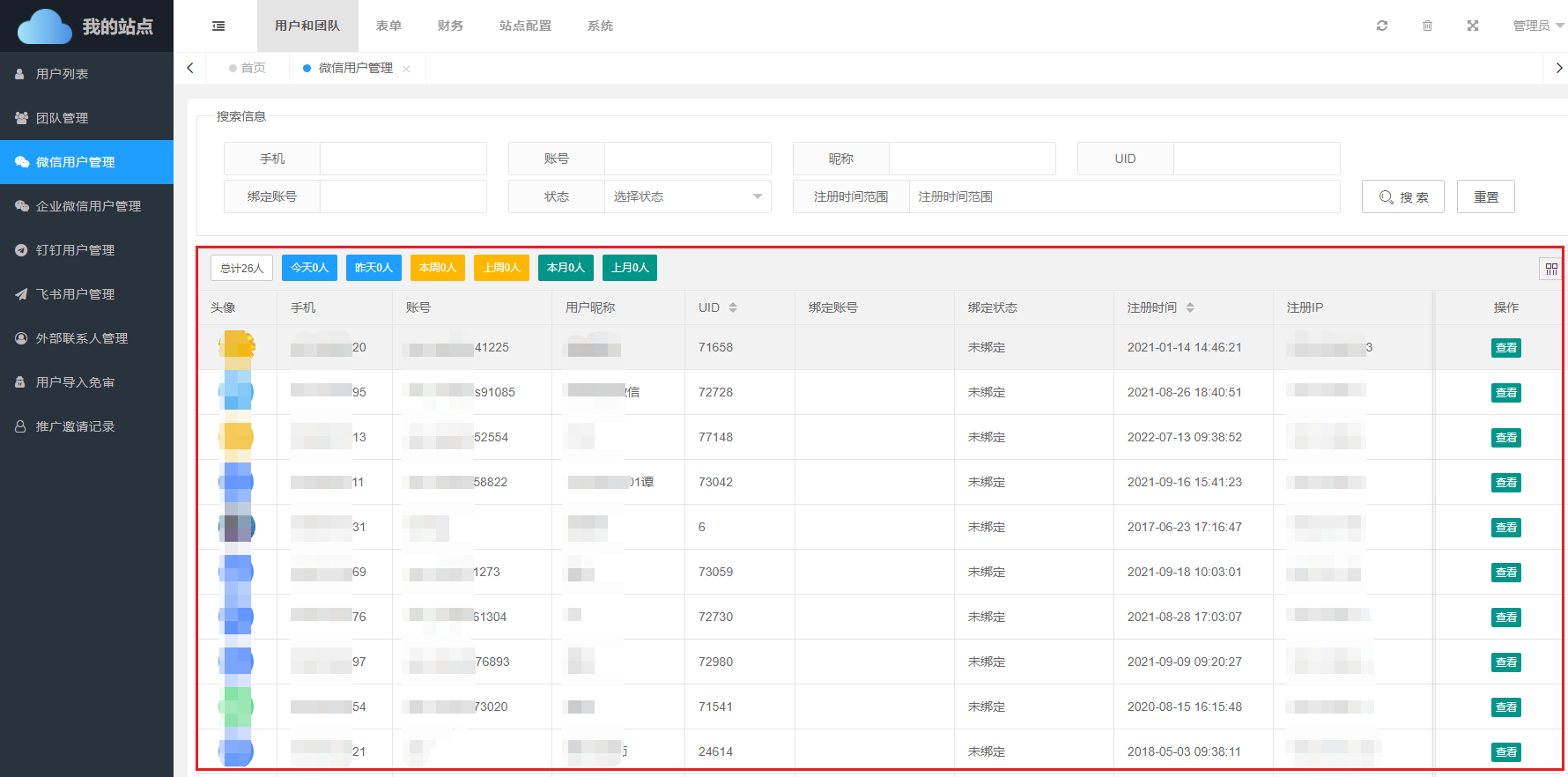 在微信用户管理列表可以对所有已绑定微信账号的用户进行管理。