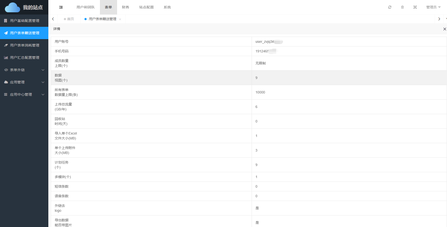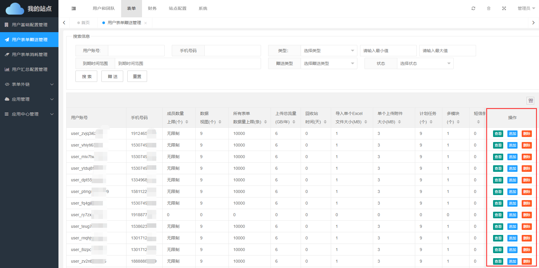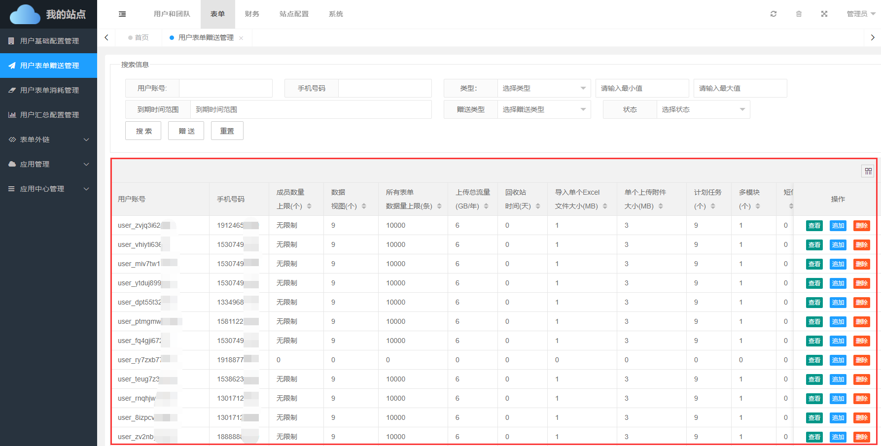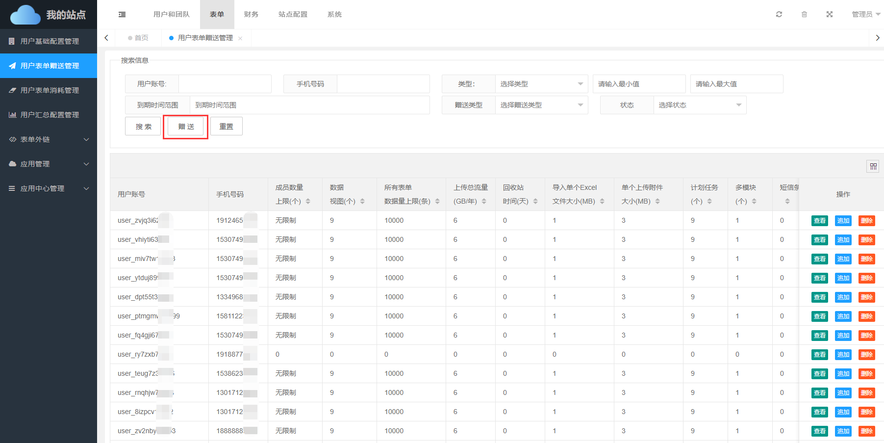 可以在用户表单赠送管理页面,直接点击赠送按钮,对指定用户进行配置的赠送操作。