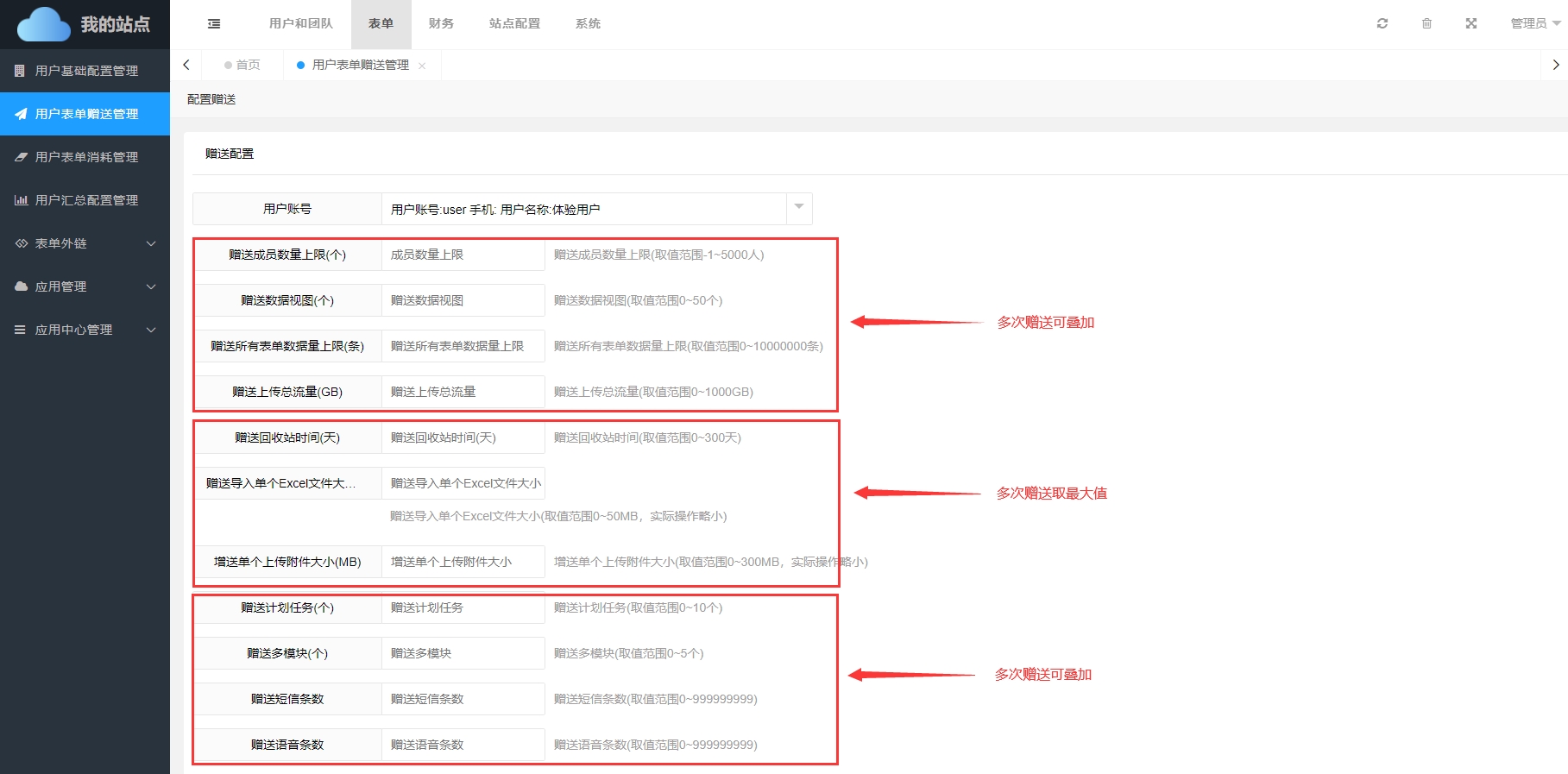 通过系统赠送的配置,会在用户表单赠送管理页面进行展示。