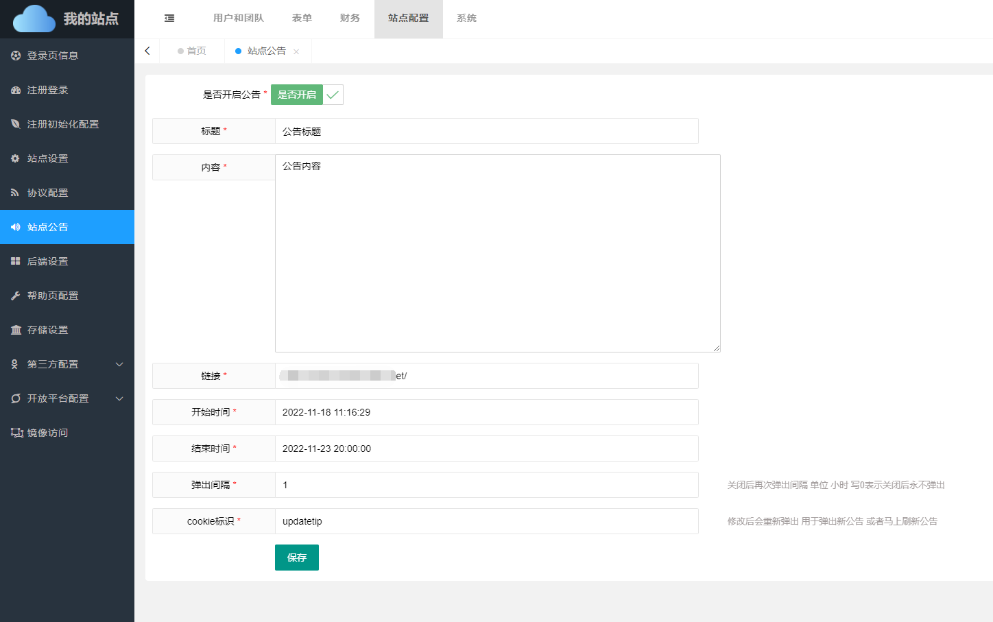 站点公告主要是用来向使用者发送全体公告,如:服务器维护公告、升级公告等。