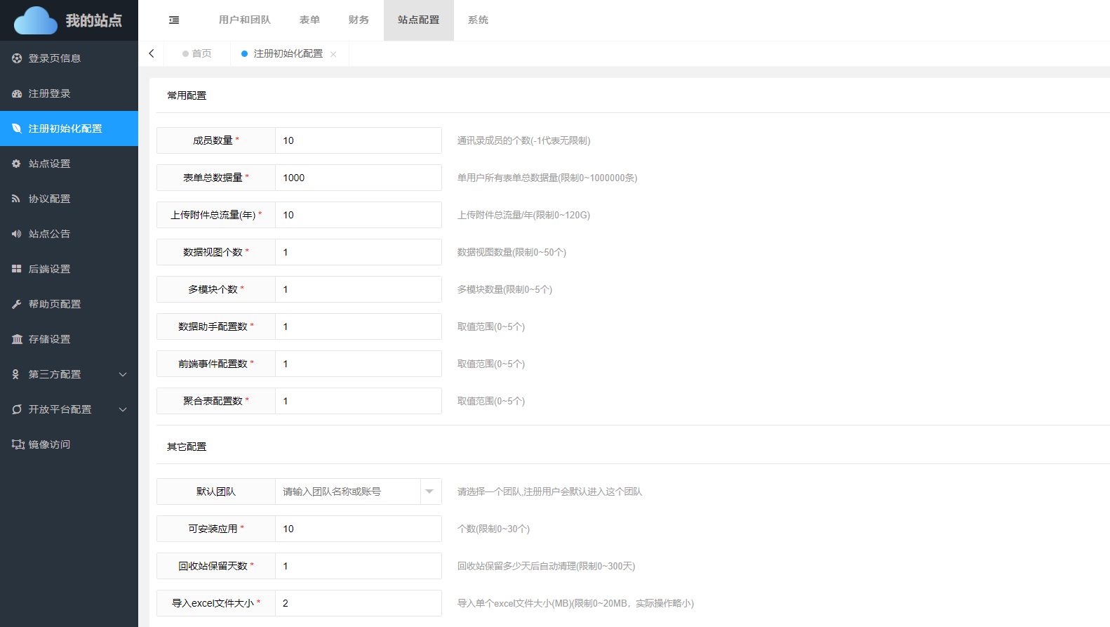 - 成员数量: 新用户注册后,其创建的团队,最大人数限制