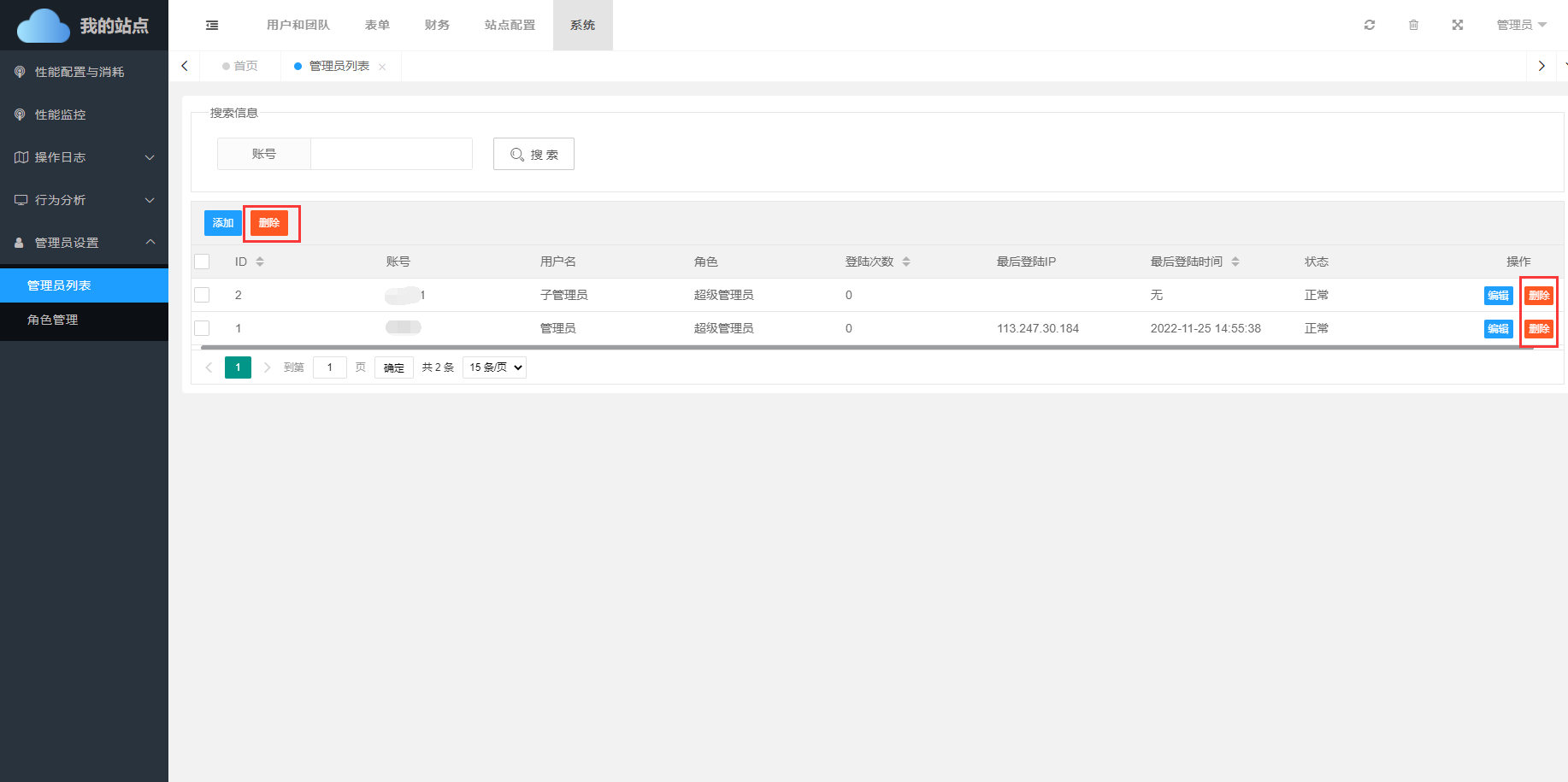 管理员可被删除,删除管理员有两种方式,分别是删除和批量删除。
