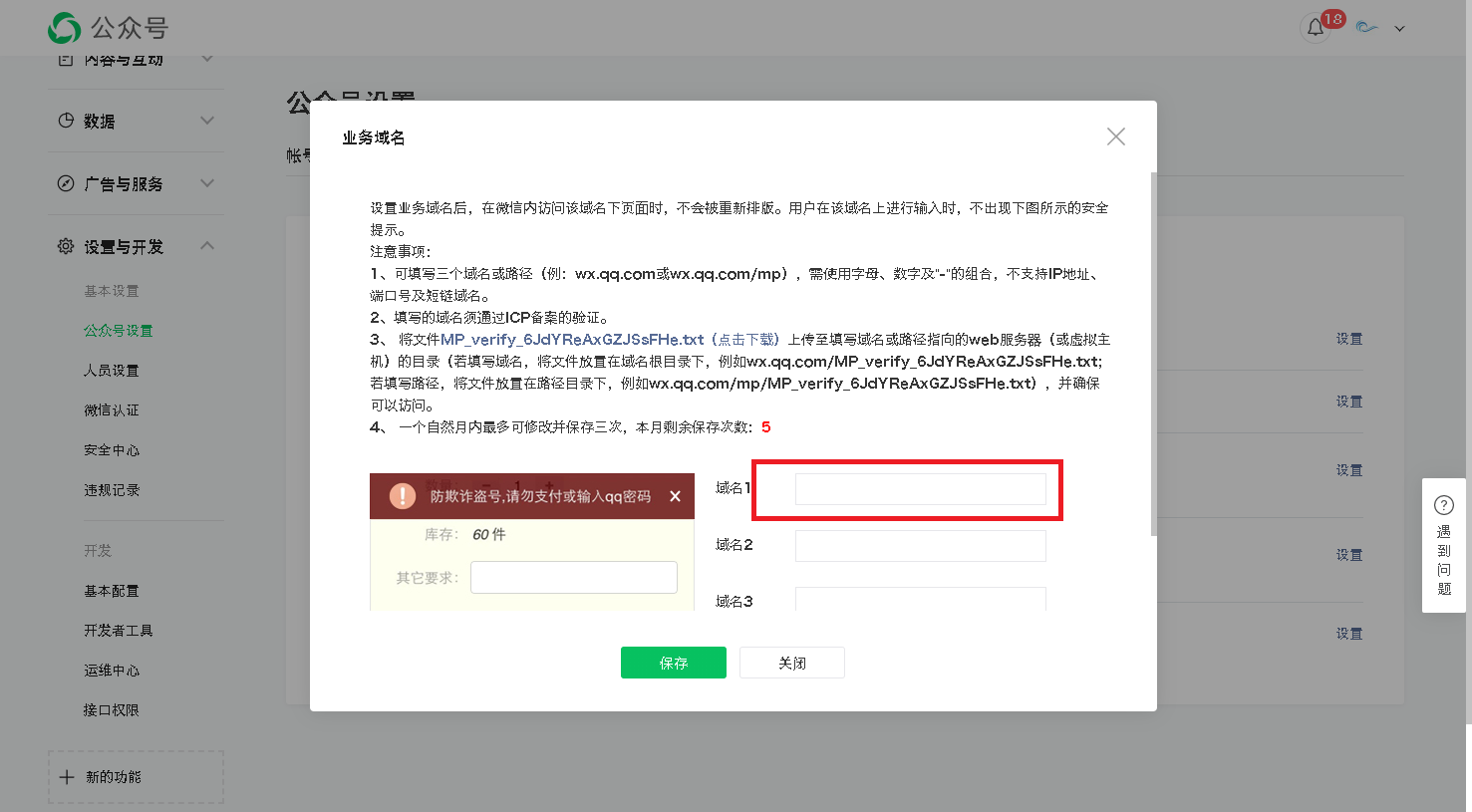 设置业务域名后,在微信内访问该域名下页面时,不会被重新排版。\ 用户在该域名上进行输入敏感信息时,不出现欺诈防盗号类的安全提示。