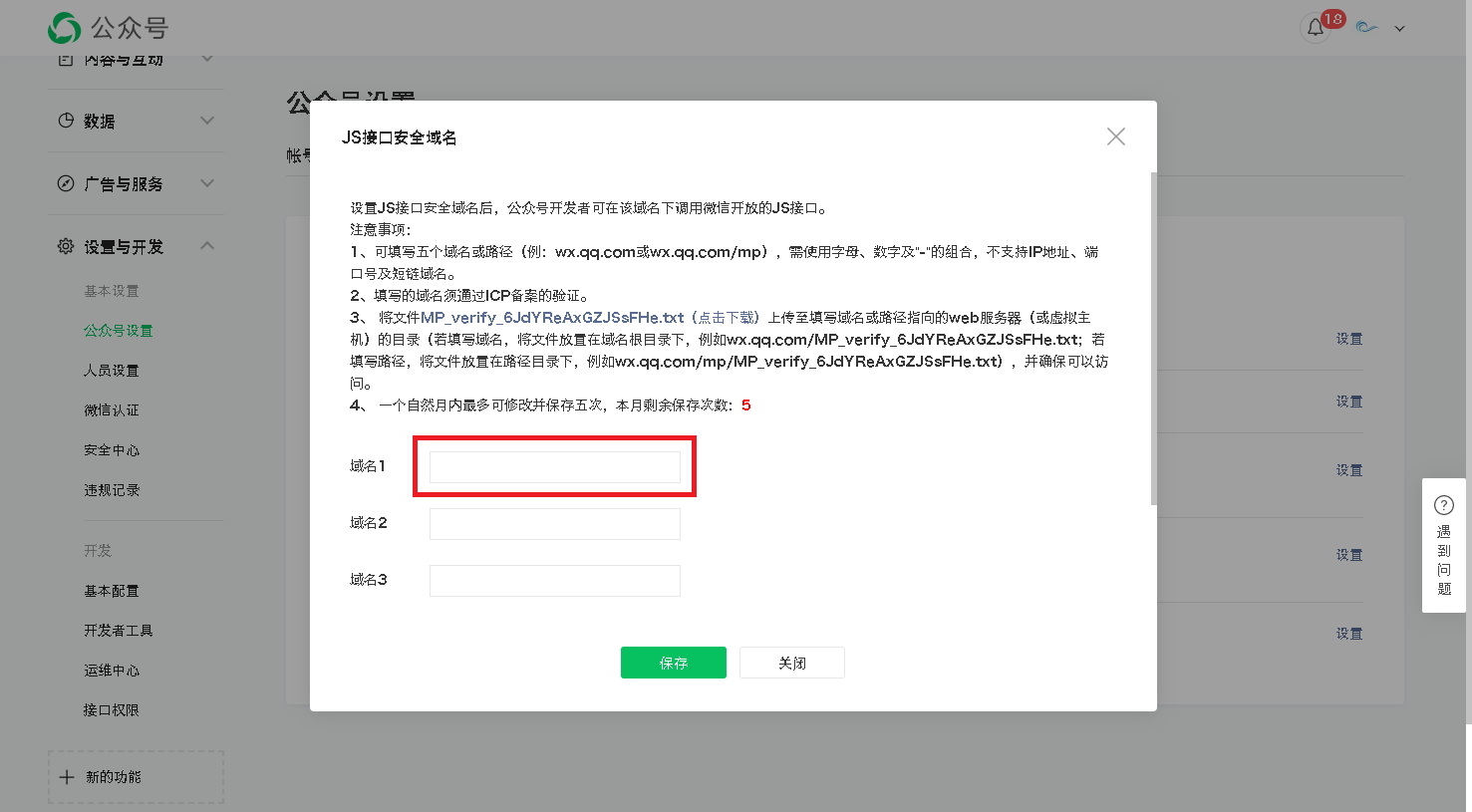 设置JS接口安全域名后,公众号开发者可在该域名下调用微信开放的JS接口。