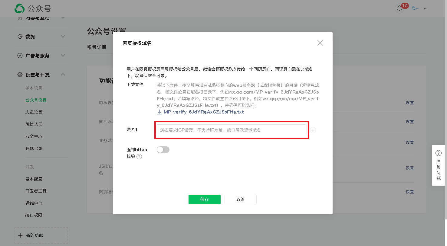 3.1.1 点击业务域名后面的设置按钮,弹出设置界面,点击文件进行校验域名文件下载