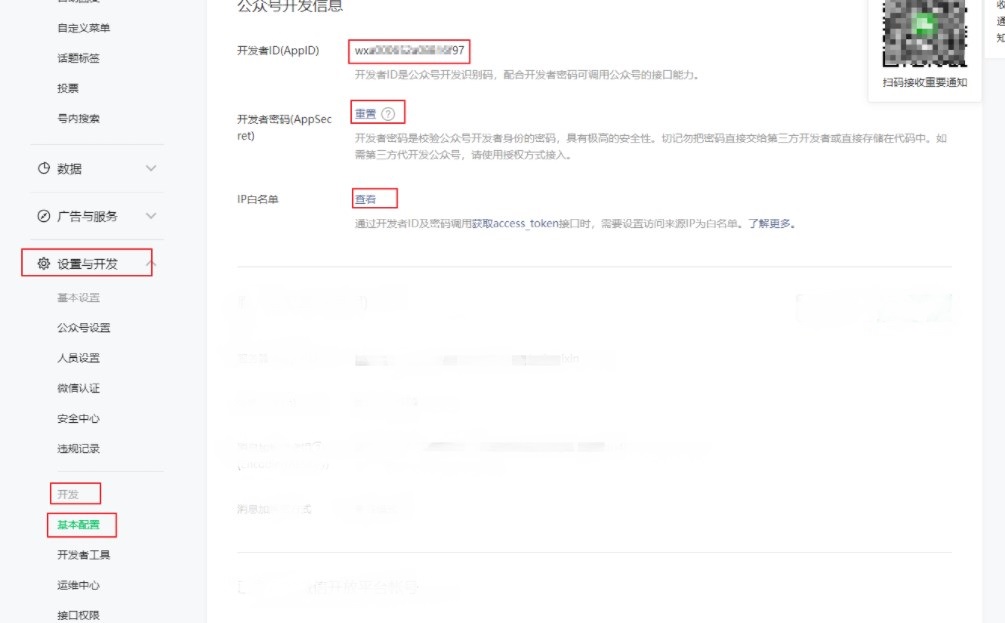 获取开发者信息AppID,AppSecret(图中右侧红色区域标注的内容)并设置IP白名单,白名单内填写私有云ip(ip可以咨询官方技术人员或用站长工具输入网站域名进行查询获取)。