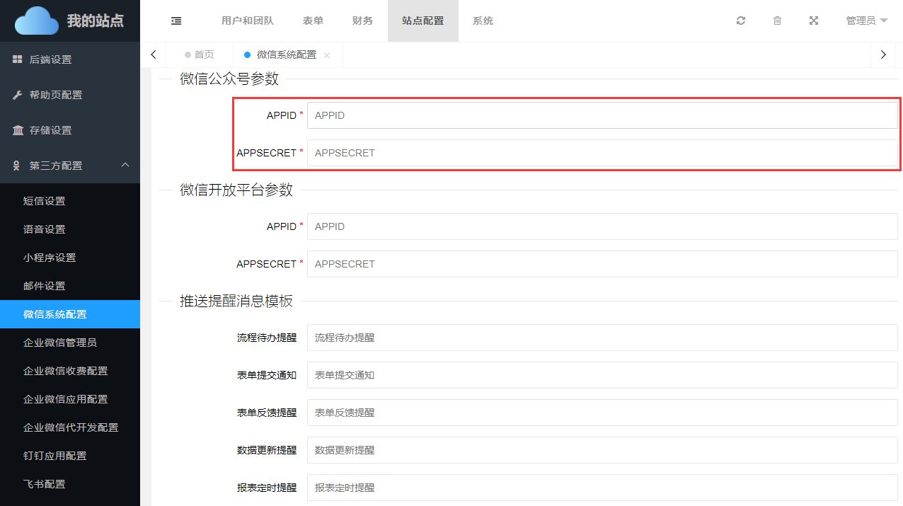 填写方式:进入私有云管理后台后,在站点配置->第三方配置->微信系统配置中 填写到微信公众号参数内。