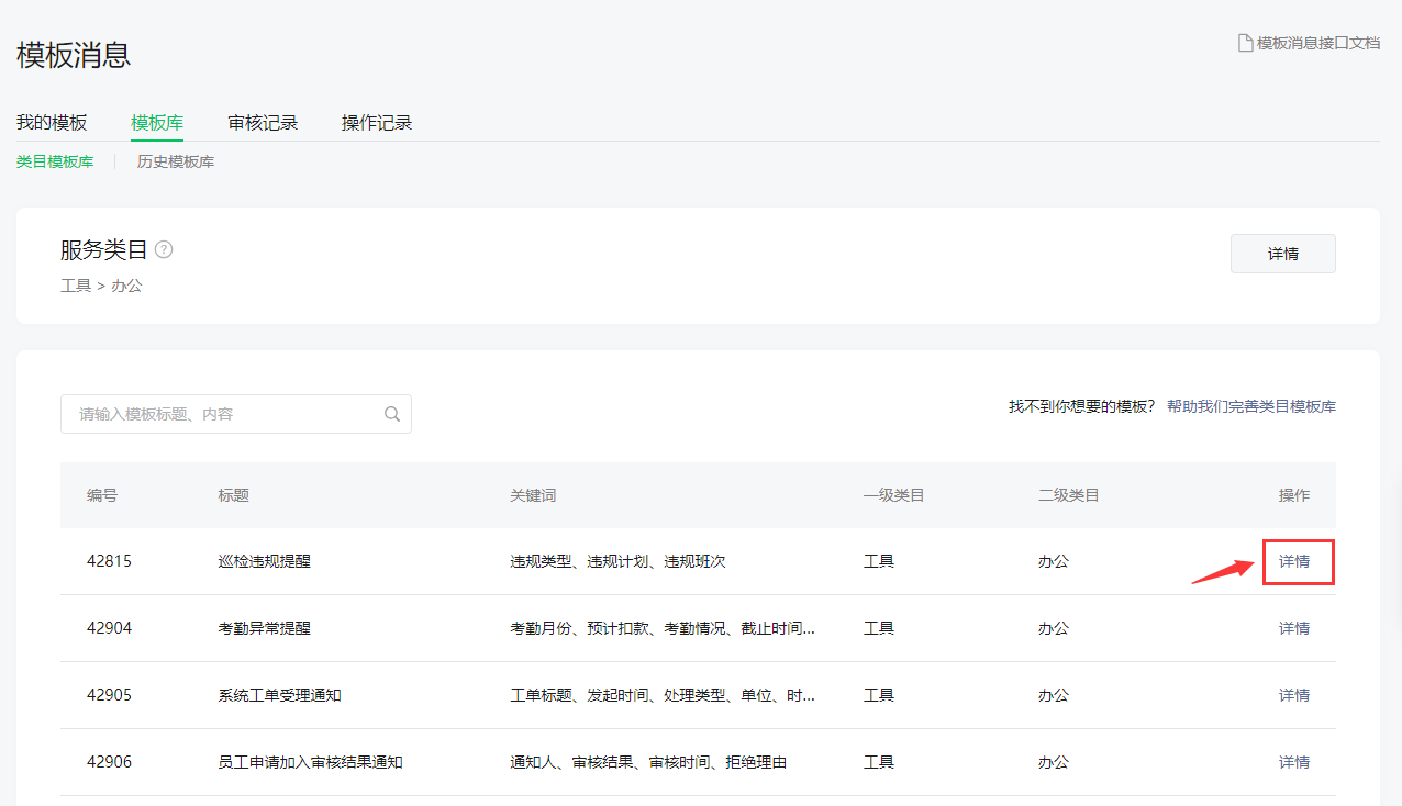 选择类目后可以看到类目相关的消息模板,在模板库中找到适合业务场景的模板,点详情查看和添加