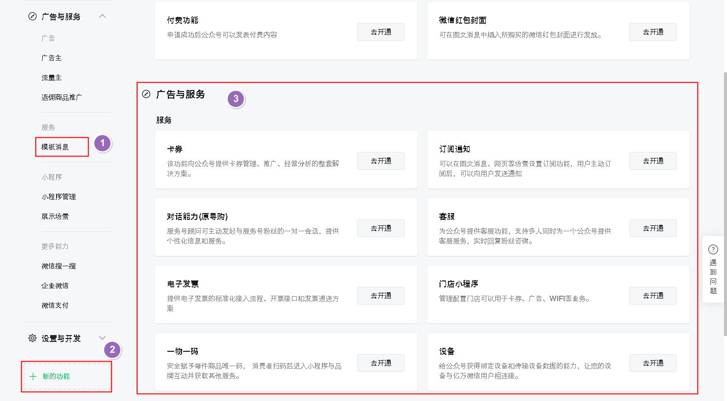 如在广告与服务类别下没有找到模板消息,则需要通过页面最下方的添加功能页面进行添加,此步骤需要审核,大概耗时5个小时。