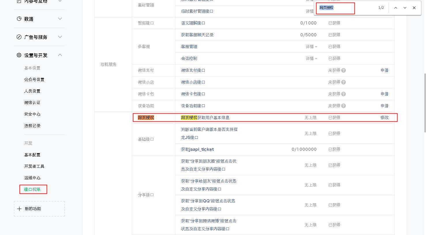 在左边纵向导航栏,依次点击设置与开发->接口权限\ 找到修改网页授权[建议用浏览器自带的Ctrl+F搜索]