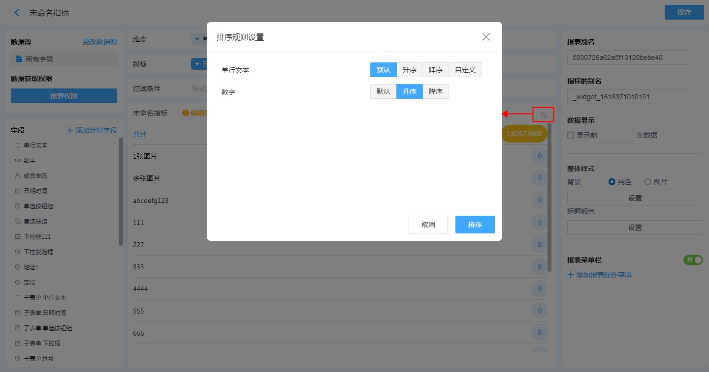 • 指标图只能给维度或指标其中一个字段添加排序规则。