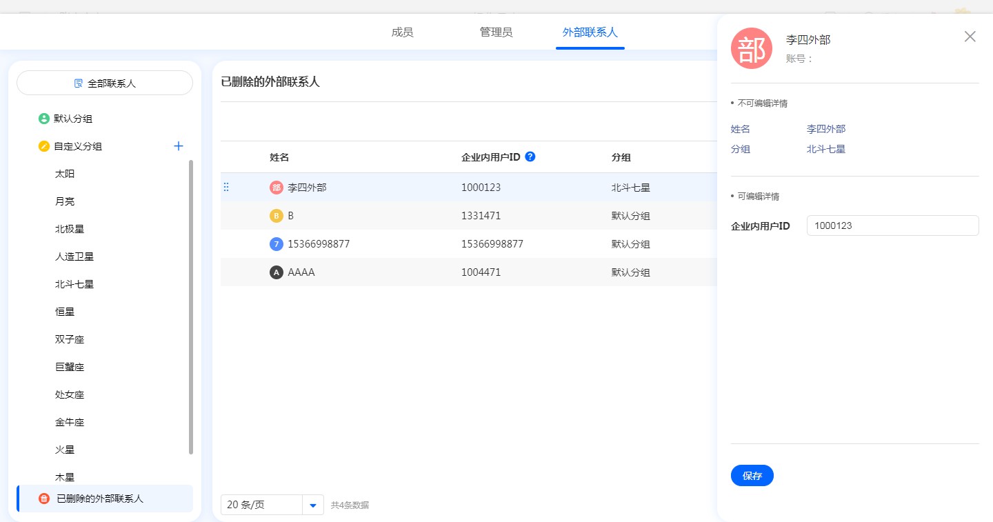 注意:已邀请状态的外部联系人删除后直接清除,不会进入【已删除的外部联系人】列表中。