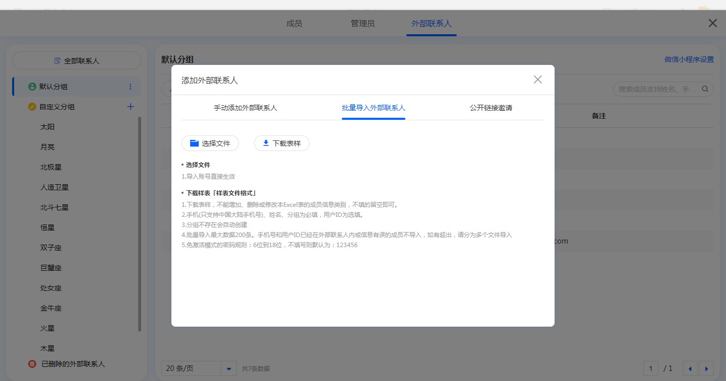 批量导入外部联系人前需下载表样,按表样进行填写,完成后点击【选择文件】进行导入。