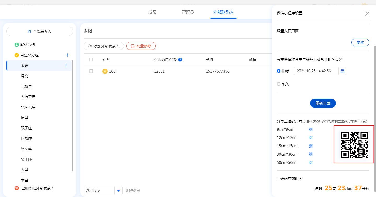 管理员在外部联系人-分组-小程序设置中,获取二维码,外部人员扫码此二维码即可加入团队,并加入该分组内。