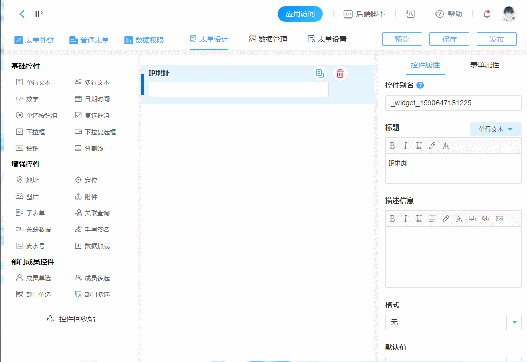 在表单页面打开或控件操作时触发,获取当前外网IP地址。