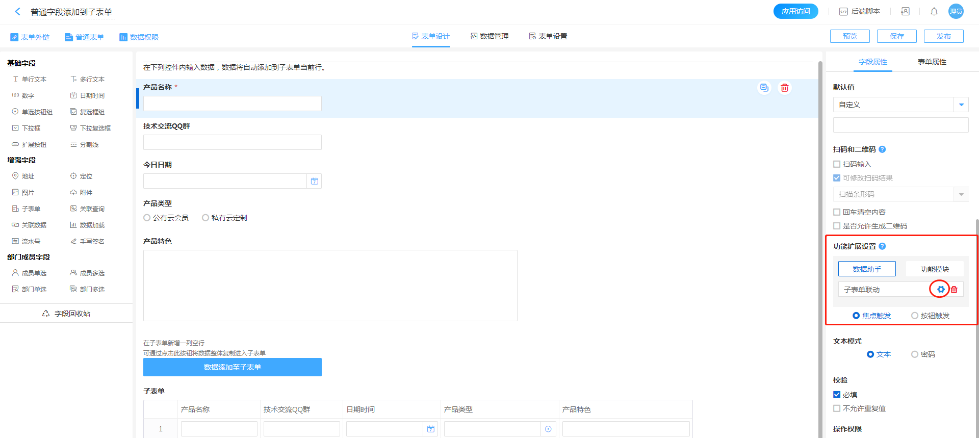 • 普通字段添加到子表单