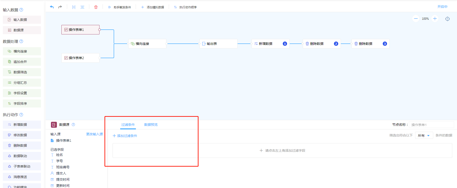 - 新增横向连接,设置主表与副表的关联字段,讲两表数据进行合并。