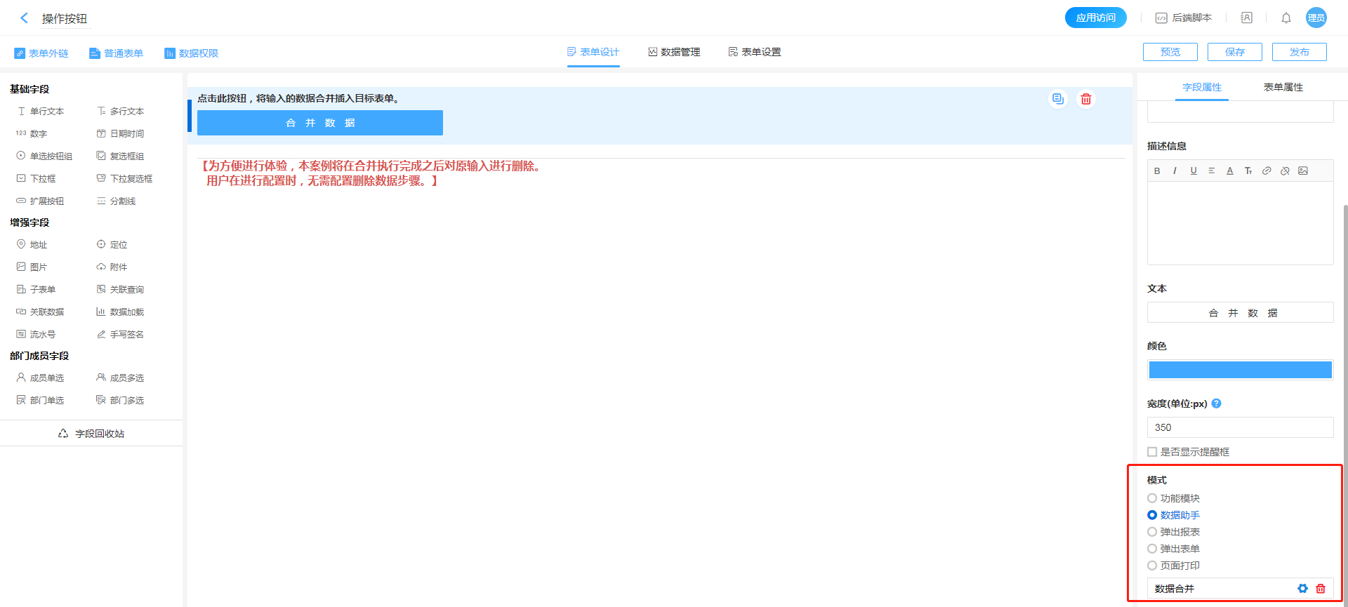 - 进入控件属性页面,或者计划任务配置页面(本案例以按钮配置为例),点击进入数据助手配置页面。