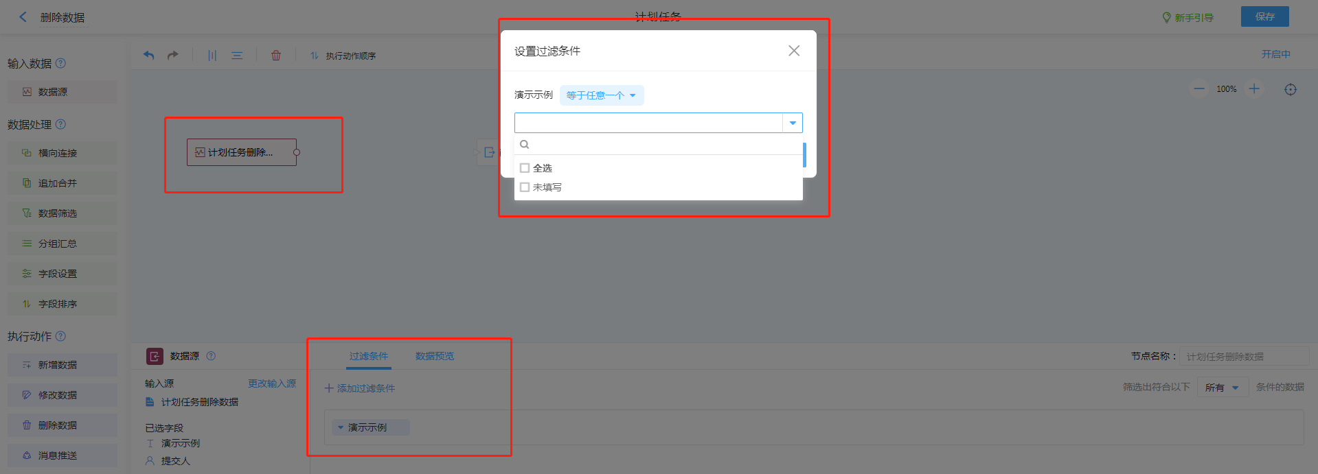 1. 输入数据选择数据源,选择需要进行数据删除的表单