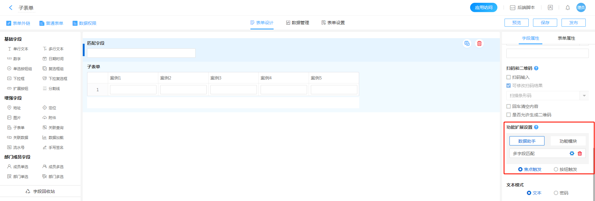 1. 进入控件属性页面,或者计划任务配置页面(本案例以单行文本配置为例),点击进入数据助手配置页面。