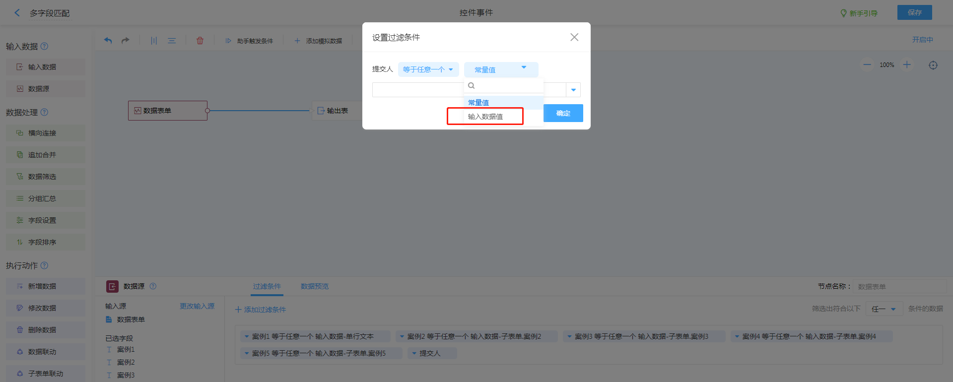 1. 设置过滤条件,根据实际匹配条件进行过滤条件设置,需要注意条件等式右边需要选择“输入数据值”,并调整为筛选符合下列【任一】条件的数据。