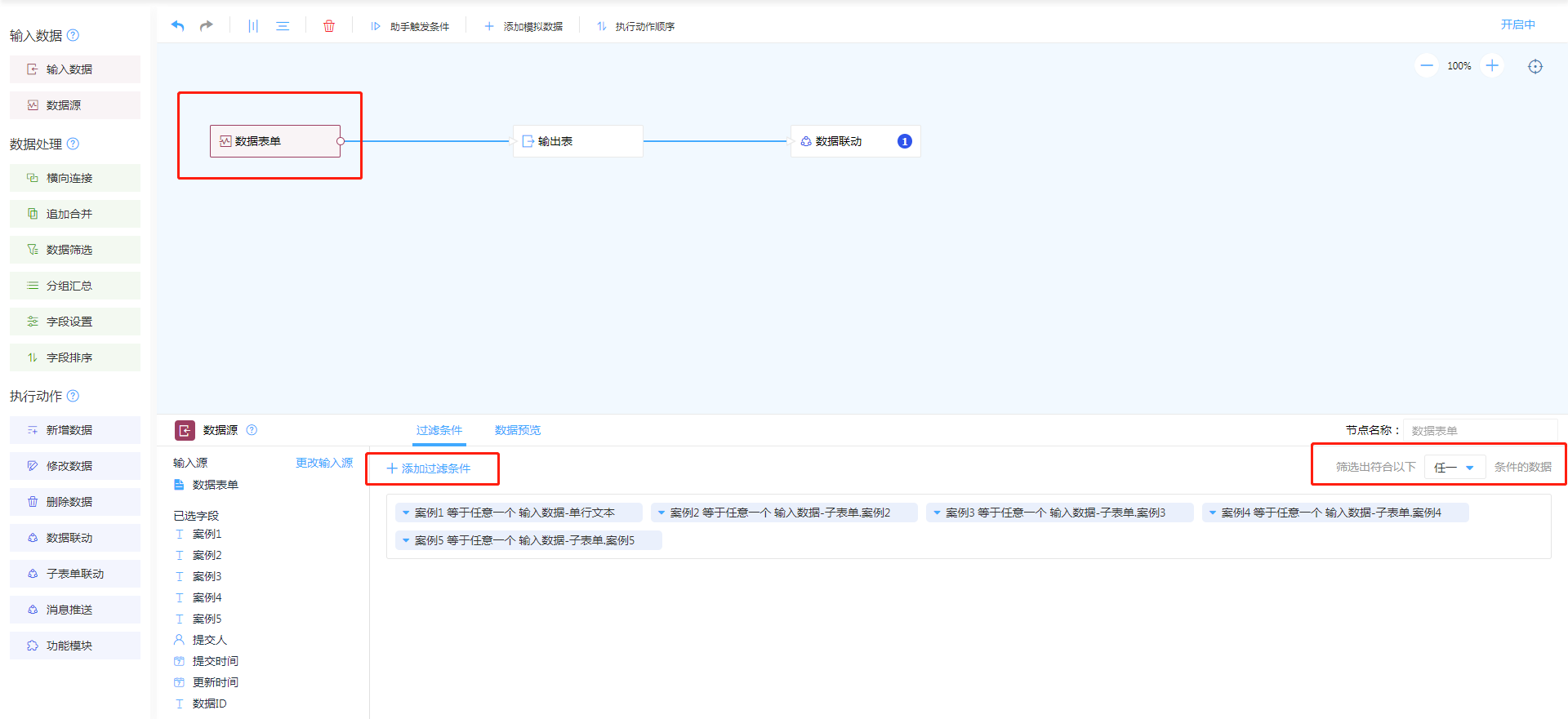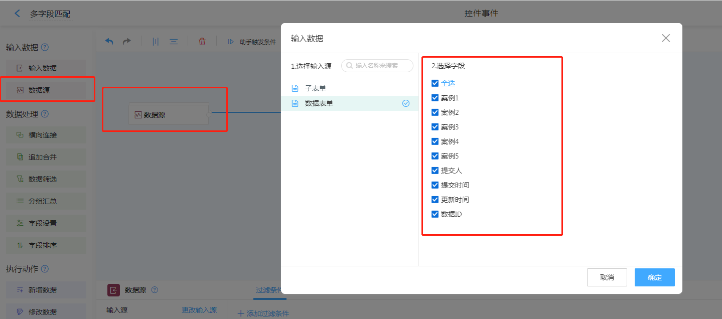 1. 输入数据选择数据源,选择需要进行匹配的目标表单
