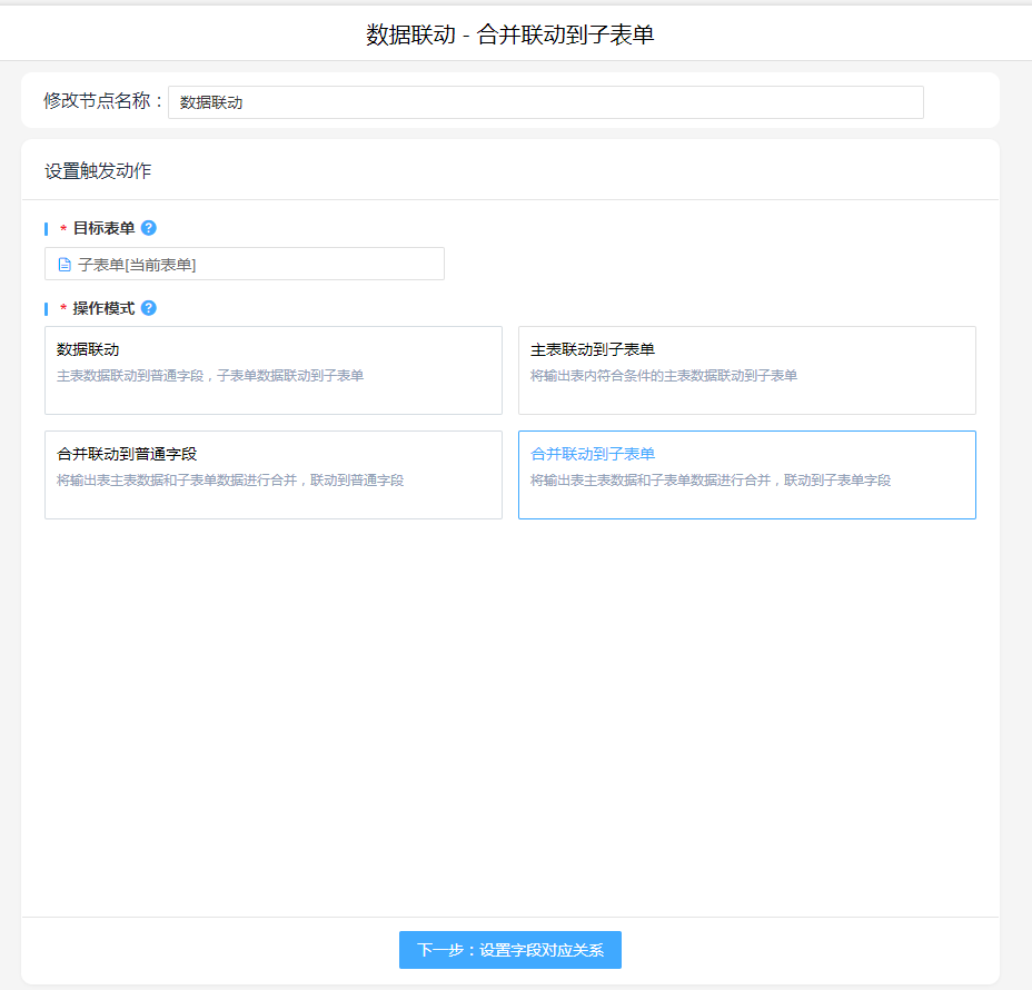 1. 新增执行动作数据联动,操作模式按照实际情况进行选择,关联字段联动关系
