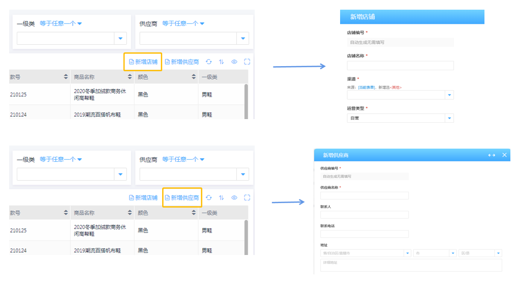在订单管理系统中汇集了订单信息、商品信息以及各项店铺基本数据,在商品查询的当前页,可以直接新建店铺或者供应商,填写相关信息提交后,将自动汇总到新建列表。