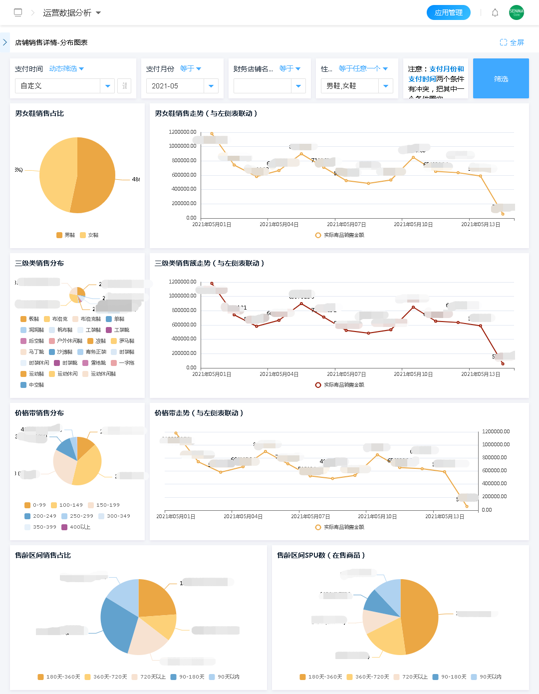 通过将销售数据转化为可视化图形报表,每个店铺的销售情况,无论是对于分类数据的汇总,还是对于销售数据的占比、趋势,都可以非常直观的展示出来。经营情况一目了然。