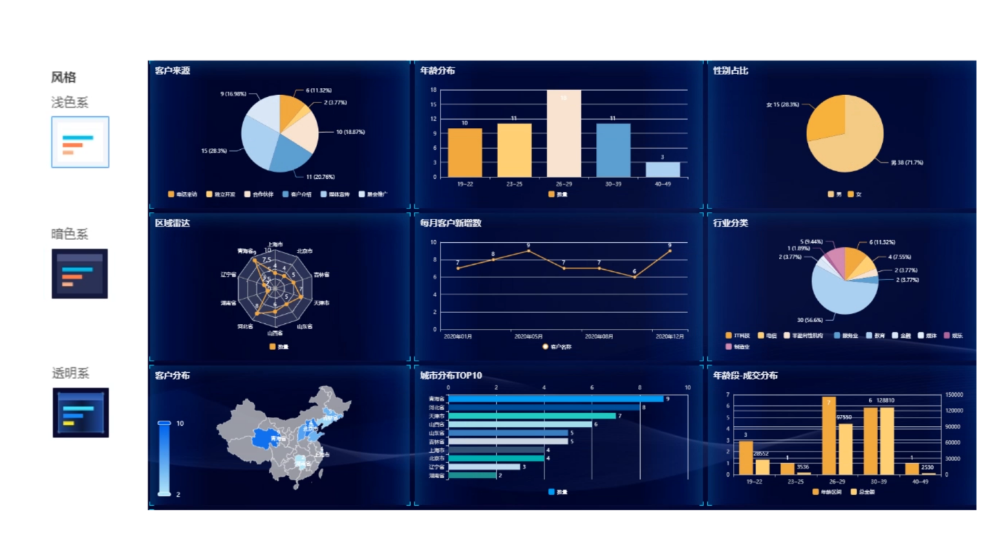 可对现有报表进行编辑,通过分析报表整体样式设置可以快速完成仪表盘视觉风格的转换。市面上酷炫的报表看板制作过程较为复杂,而重深不仅对于单个组件的特殊展示需求支持单独配置,也支持快捷设置报表整体风格,风格一键即可切换。