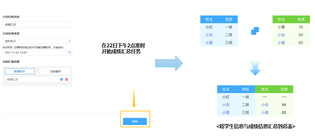 以家校管理中的学生成绩汇总为例,学生每个学期不同类型考试的成绩汇总,需要操作大量的数据表单,在重深通过计划任务功能配合数据助手,能够有效为老师减负。