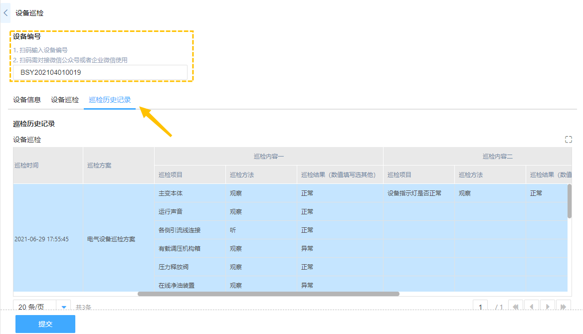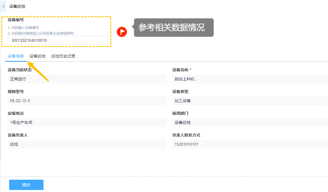 也可以参考其他表单的一条或多条数据情况,例如设备管理中就可以在设备巡检中看到报修、巡检以及保养记录了。
