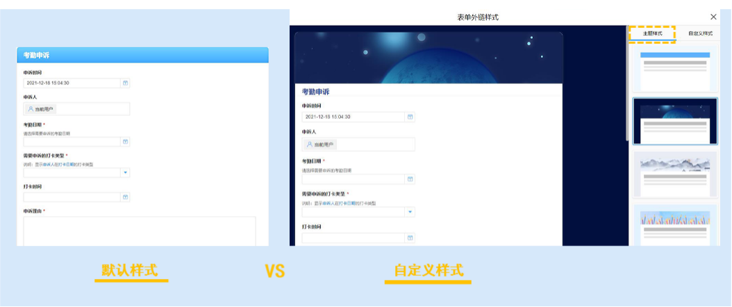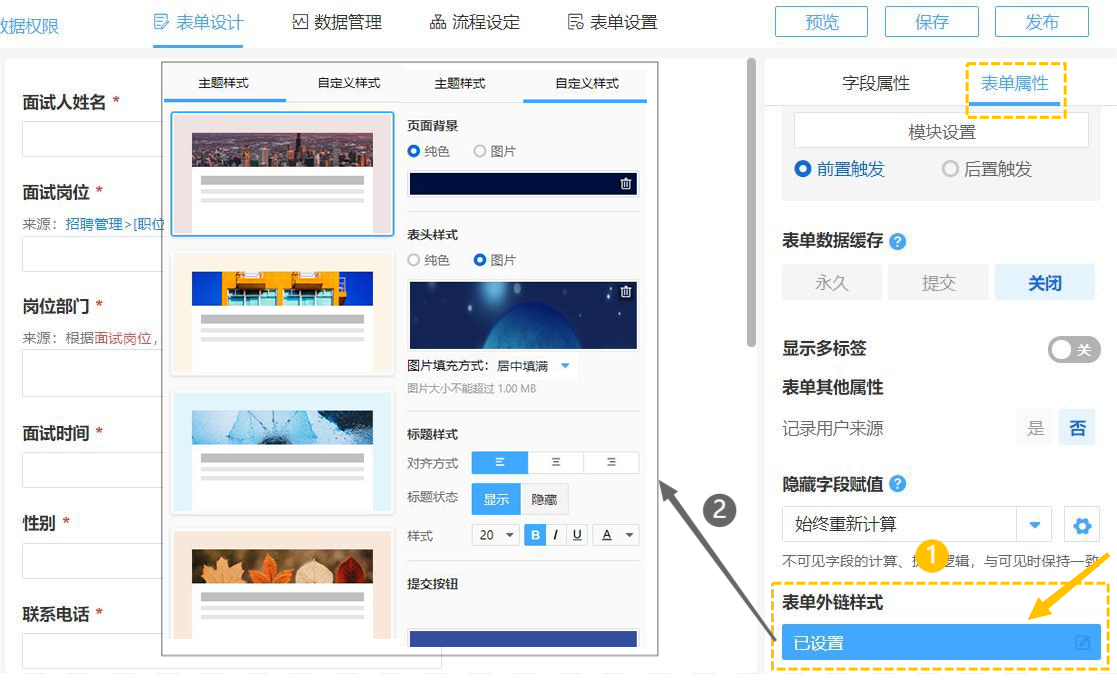 每个企业都有自己的品牌标识,通过表单设计>>表单属性>>表单外链样式的个性化设置,可以从第一视觉观感上树立品牌形象。重深不仅提供了20多套主题样式可供选择使用,也可以由你自定义外链样式,借助视觉效果来更好的提升品牌辨识度。