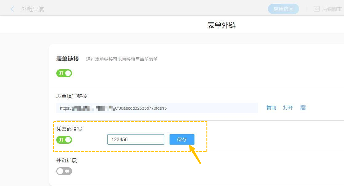 如果要防止无关人员访问表单也可以设置外链密码,开启凭密码填写后设置密码,则必须凭密码才能打开表单,保证表单的保密性。