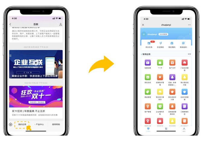 以重深公众号为例,配置完成后,我们可以在移动端实现丰富的办公体验。在公众号的菜单栏点击我的应用即可进入到移动端工作台。