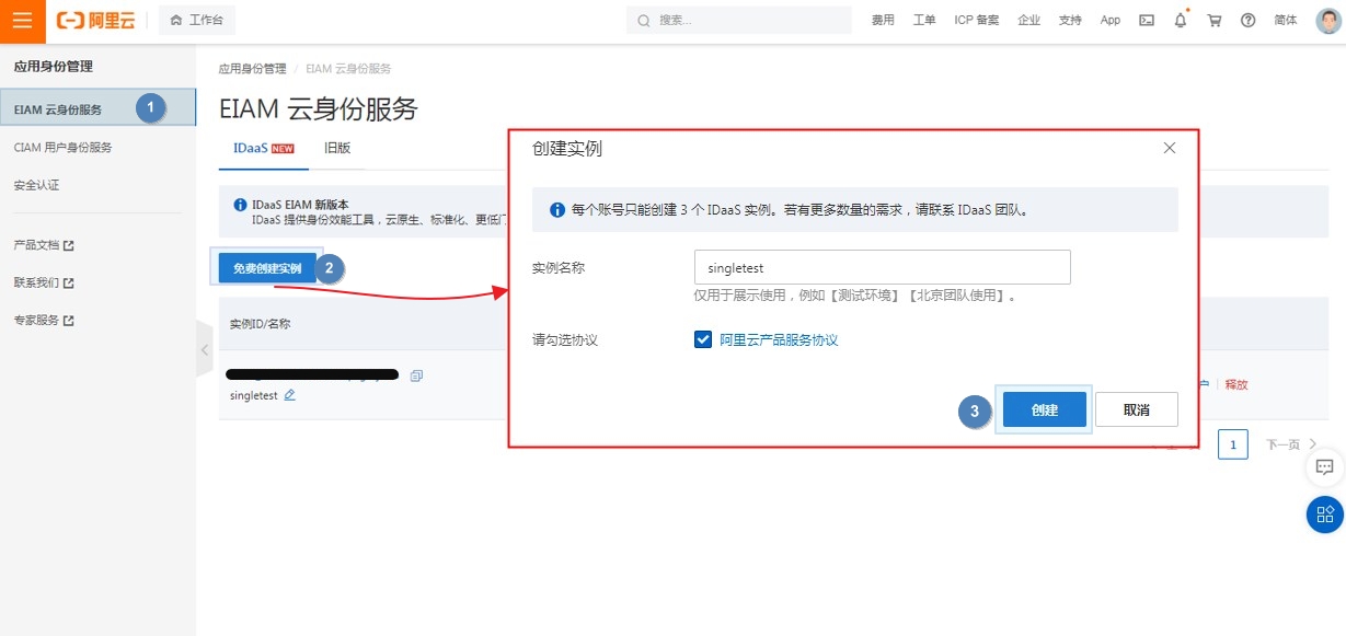 (2).在 EIAM云身份服务中,点击【免费创建实例】,输入实例名称并勾选协议后点击【创建】。
