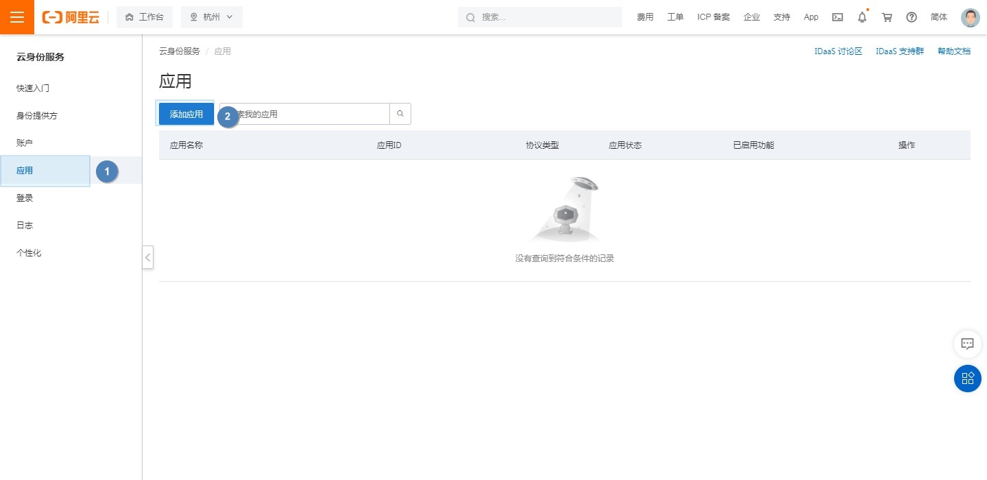 (2)进入云身份服务中,选择应用,在应用页面点击【添加应用】。
