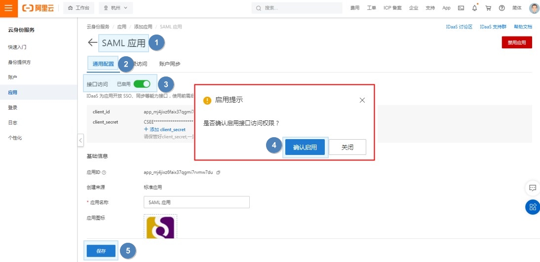 进入【SAML应用>>通用配置】处,开启接口访问。