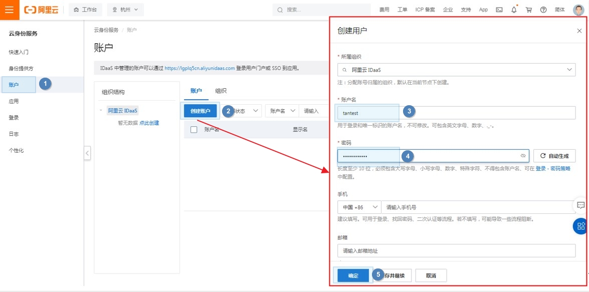 进入【云身份服务>>账户】页面,点击创建账户,输入账户名、密码等信息,点击【确定】。