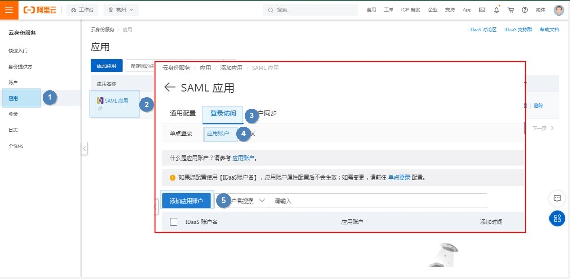 (2)进入阿里云的【云身份服务>>应用>>单点登录>>应用账户】中,点击【添加应用账户】。
