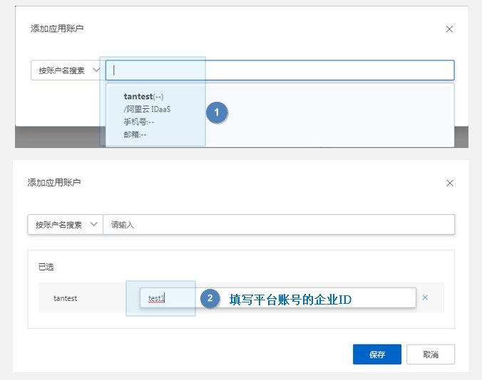 (3) 选择步骤 3.3 中创建的账户,在输入框中输入需要进行单点登录的成员企业ID,【保存】。