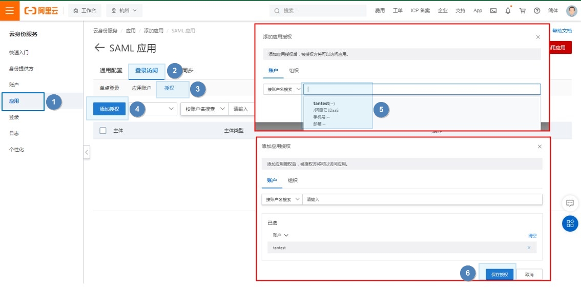 进入【SAML应用>>登录访问>>授权】处,点击【添加授权】,选择步骤 3.3 中创建的账户,点击【保存授权】。