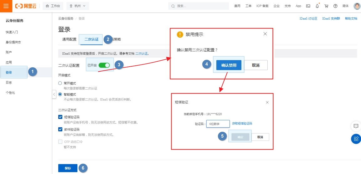 进入【云身份服务>>登录>>二次认证】中,关闭【二次认证配置】按钮,点击【确认禁用】并输入验证码后,点击【确定】即可禁用。