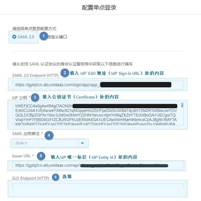 单点登录配置项如下所示,部分配置信息需复制阿里云 SAML应用中的应用配置信息。