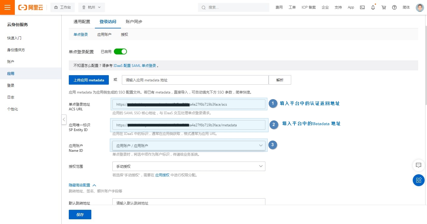 返回到阿里云 SAML应用配置页面,按照如下所示进行配置,部分配置内容需要复制平台中单点登录信息。