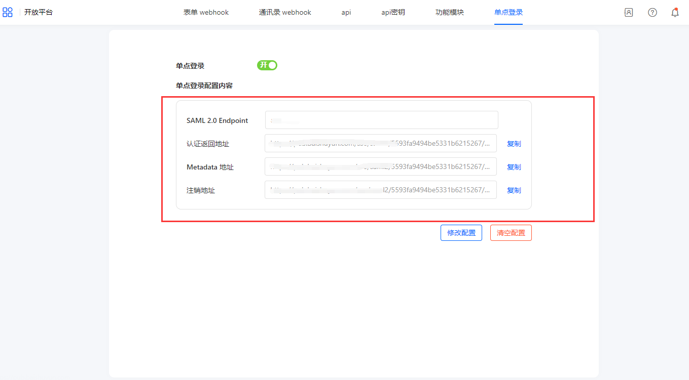 完成单点登录配置后,会生成对应信息: