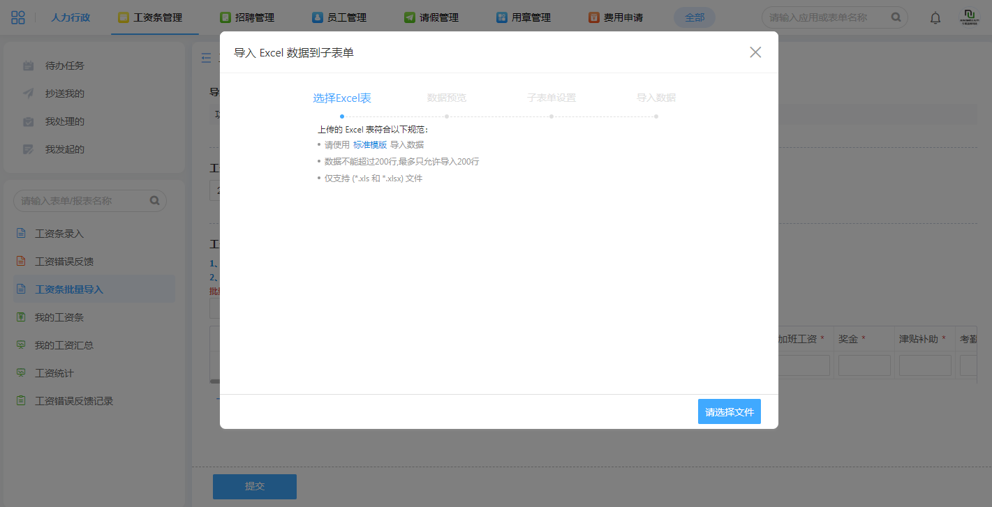 员工派遣的流程借助线上表单可以被完整记录,当需要操作较多人员的劳务派遣流程时,可以借助数据加载功能,批量勾选人员名单。