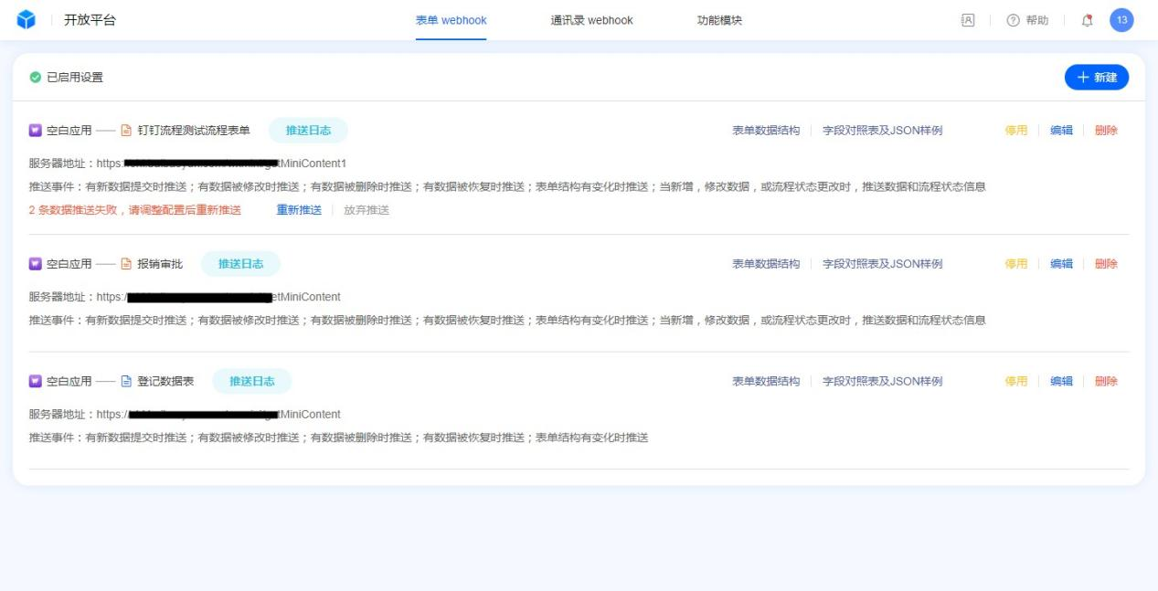 1.表单webhook 当表单结构和数据的发生变更时,将操作与变更后的数据推送至目标服务器。