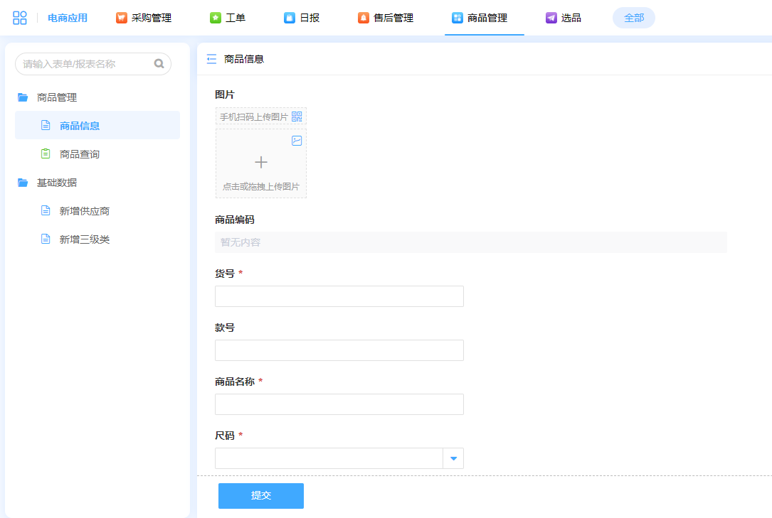 商品管理板块凭借在线表单、报表等平台功能,方便实现商品信息导入导出和统一管理,商品信息实时可查以及为实现优质选品提供数据支持。